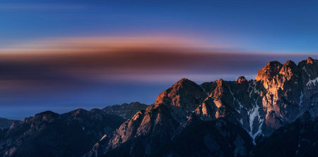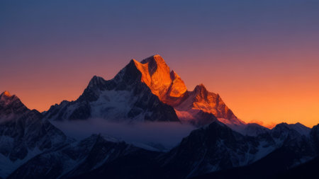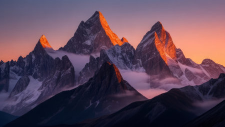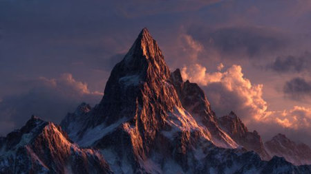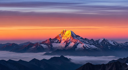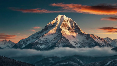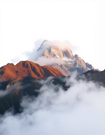 Captivating image of a rugged mountain peak rising majestically above soft clouds, bathed in the warm hues of sunset, creating a tranquil and serene atmosphere.