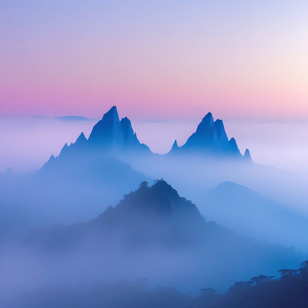 Two prominent, sharp blue mountain peaks emerge from a dense, soft purple and blue mist. The sky above displays a gentle gradient of pink and purple, suggesting either dawn or dusk. The scene is characterized by its serene and atmospheric quality, with the fog creating a sense of depth and mystery.