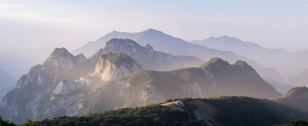 Layered mountain peaks shrouded in mist are illuminated by the soft, warm glow of a sunrise, creating a serene and ethereal landscape.