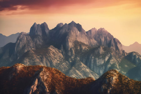 An Ai-generated illustration of rocky mountains during a breathtaking sunset in the evening
