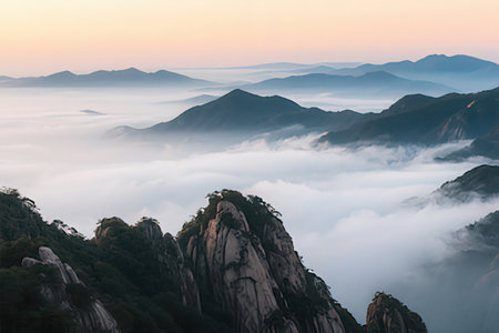 Landscape view of mountain with fog in the morning at Huangshan, China