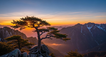The sunset over the steep granite cliffs, the Huangshan pines (Pinus hwangshanensis) and the rhododendrons of the Huangshan Mountains (also called Yellow Mountains) of Anhui Province, China