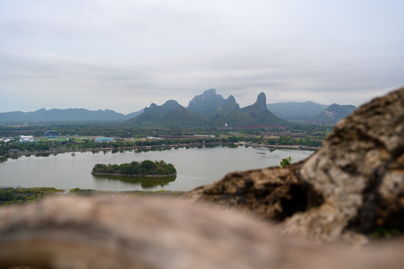 Dusk of mountain landscape at Kui Buri District, Prachuap Khiri Khan province of Thailand. Vertical template image.