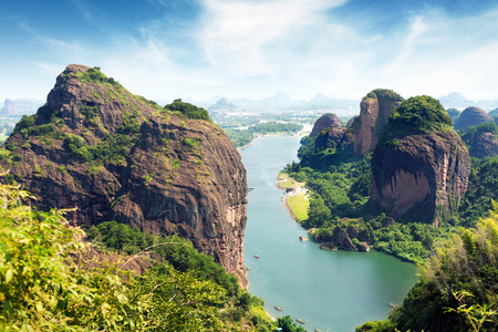 Landscape in Danxia Mountains (Danxiashan) in Renhua County in Shaoguan (Guangdong Province) in China. AAAAA rated tourist attraction. Yaotang village and Jinjiang river.