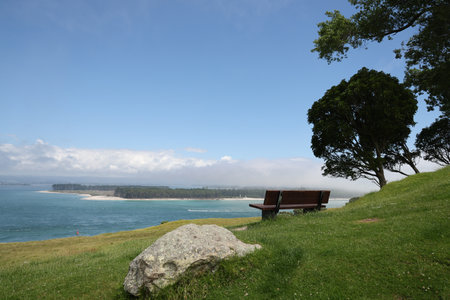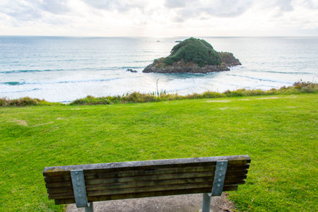 View of Main Beach and Moturiki Island under bench seat Mount Maunganui.
