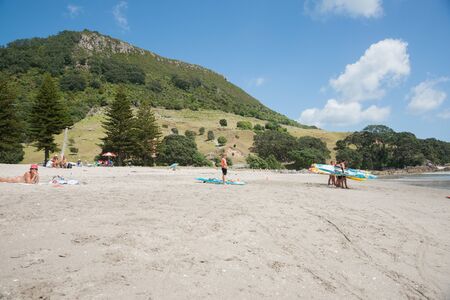Mount Maunganui, New Zealand - December 31, 2017: Tourists gather at Mount Maunganui beach near Tauranga in New Zealand.