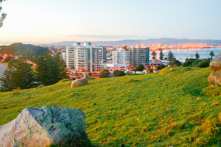 Sheep sitting on slope of Mount Maunganui overlooking town at dusk with motor-camp at base and apartment buildings