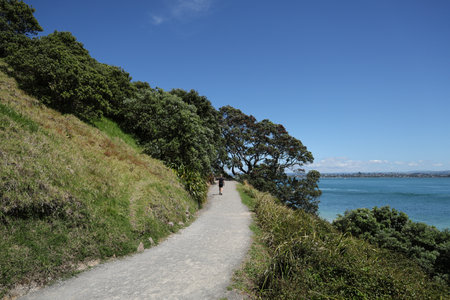 Walking on Tapeka track at sunrise with panoramic view of Russell, Bay of Island