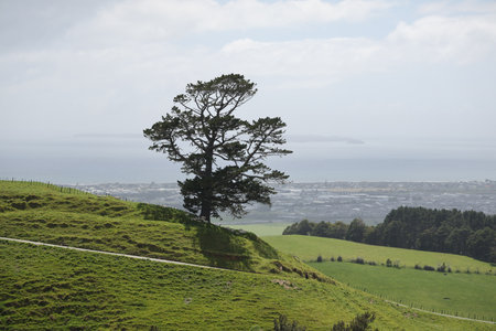 Lone Evergreen Tree Overlooking Coastal Pasture Valley