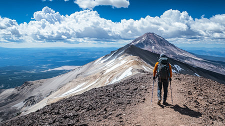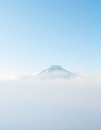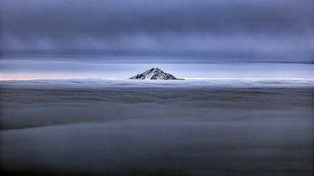 Majestic volcanic mountain peak rising above the clouds