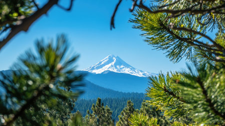 Pine branches forming a natural frame around a distant snow-capped mountain peak under a clear blue sky