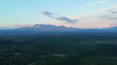 Aerial view flying over forest toward kamchatka volcanoes.