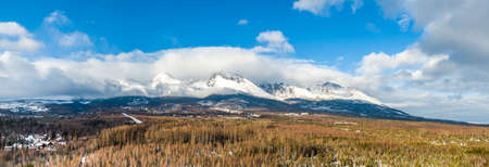 Aerial drone panoramic view of High Tatras mountain range (Vysoke Tatry in local speak), Slovakia national nature park. Winter and snow.