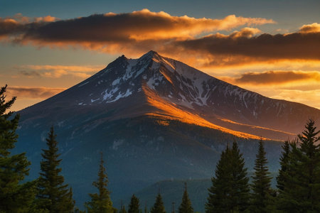 Breathtaking panoramic view of majestic snow-covered mountains with evergreens and vibrant sky
