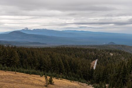 Road through pine forest seen from Crater Lake, Oregon, USA