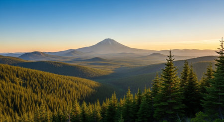 Distant mountain peak over forested hills during sunset