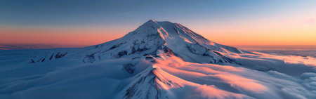 Mountain peak during sunrise with pastel colors, scenic landscape. Tranquil nature and outdoor concept