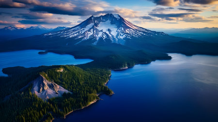 Aerial view of Mt. Hood and Lake Shasta at sunset.