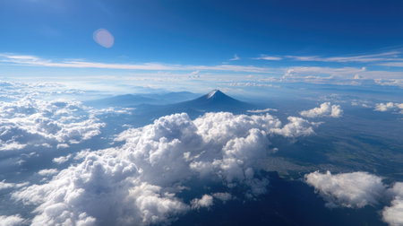 A stunning aerial view showcases a majestic volcano rising above a sea of fluffy clouds under a bright blue sky, highlighting nature's breathtaking beauty.
