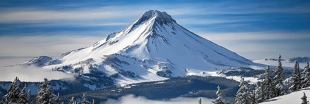 Mt. Hood in winter with snow and coniferous forest