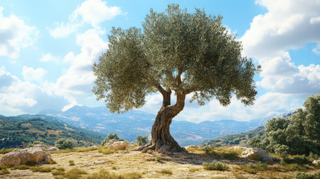 An impressive olive tree stands alone on a sunny hill, showcasing vibrant greenery against a backdrop of mountains and a bright blue sky.