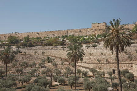 Terraces of the Kidron Valley and the the wall of the Old City in Jerusalem in Israel.
