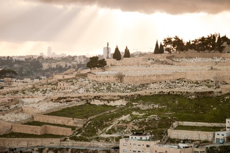 Panorama of Jerusalem from the Mount of Olives, with cloud in the sky and beautiful rays of sun