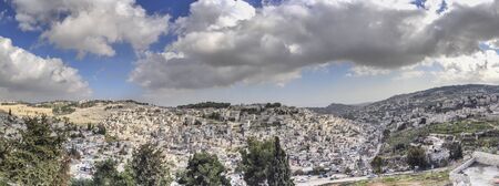 Beautiful panoramic aerial view of the Old City, Tomb of the Prophets and Dome of the Rock during a sunny and cloudy day. Taken in Jerusalem, Capital of Israel.