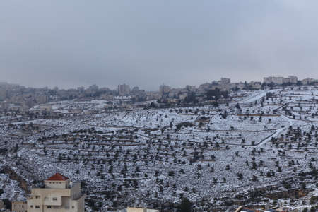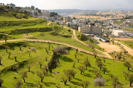 Panorama of Jerusalem. Roads. Residential neighborhoods. Slopes with olive trees.