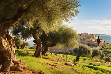 Traditional plantation of olive trees grove. Spanish nature landscape. Generative AI