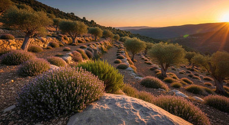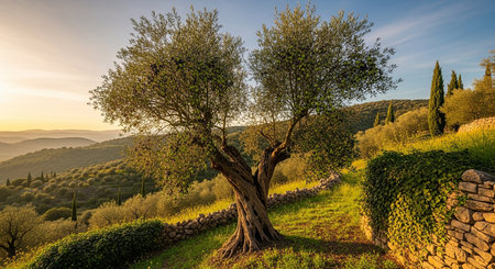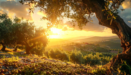Sunset in the Tuscan countryside with olive trees and ripe fruits