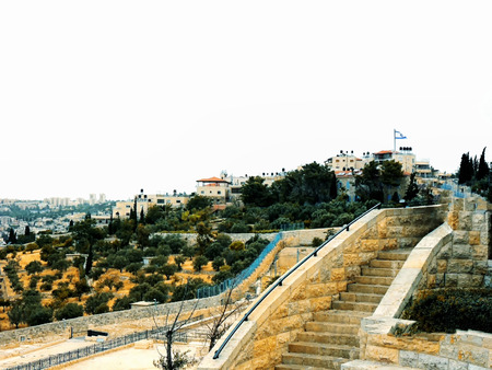 The Panorama Jerusalem mountain range Moriah with antique fortress
