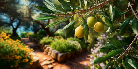 Vibrant Olive Branch Fruits Glimmering in Golden Light, Creating a Serene and Relaxing Outdoor Scene