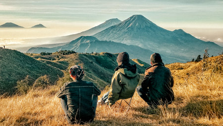 Wonosobo, Indonesia June 16 - 2019. Three people looking awesome mount above the hill