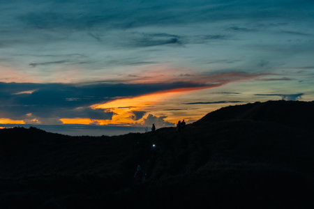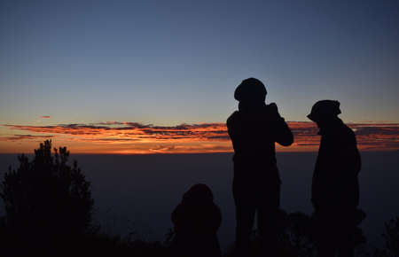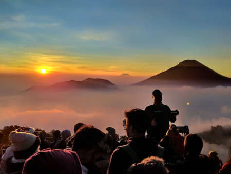 Wonosobo, Indonesia August 31, 2019. Prau Mount, the beautiful silhouette of the sunrise and the view of the mountain , people in the morning