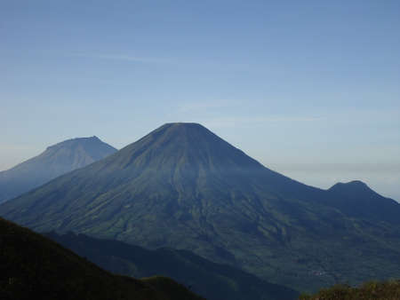 Landscape of Mount Sindoro seen from the peak of Mount Prau on a clear morning. Panorama of Mount Sindoro with the peak of Mount Prau in the foreground.