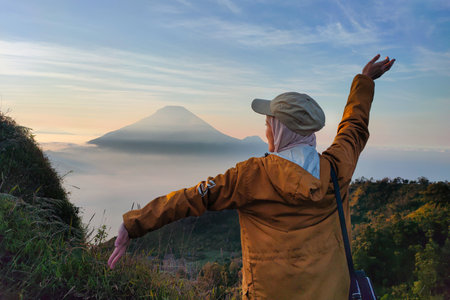 Young muslim girl having a vacation looking at mount Sindoro.