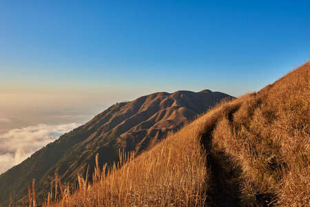 Photo of mountains and dormant stratovolcano, Mount Merbabu, covered with fog during sunrise near Yogya in central Java province in Indonesia. This is very remote location, rarely visited by people.