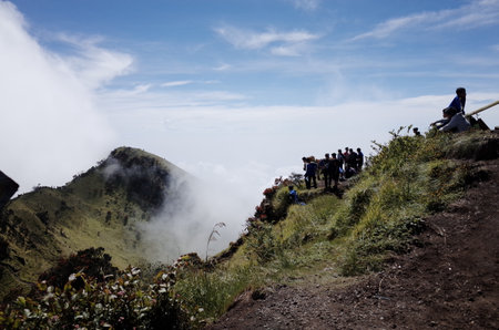 MOUNT RINJANI NATIONAL PARK, INDONESIA - JULY 22, 2016: People go uphill on the narrow footpath. Trek to Mount Rinjani on July 22, 2016 in Mount Rinjani National Park, Indonesia
