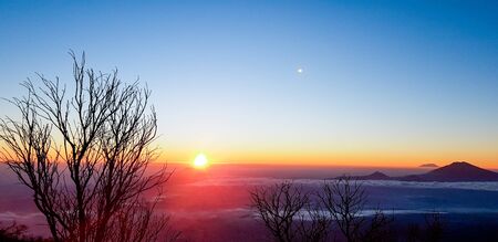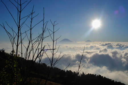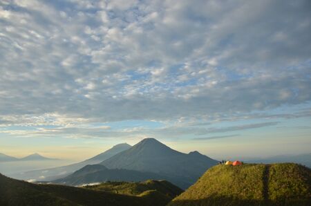 Panoramic photo of mountains and Mount Merbabu covered with sunlight and fog during sunrise near Yogya in central Java province in Indonesia. In this region, one can only meet people from isolated local tribes.
