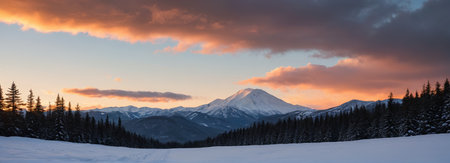 Blanket of fog rolling below Mount Saint Helens during sunset panorama