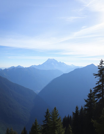 Majestic mountain peak rising above a valley shrouded in morning mist. Vast, snow-capped summit against a clear, vibrant sky. Green forested slopes and valleys