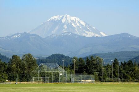 A majestic Mount Rainier towers over a soccer field in Washington State, USA.