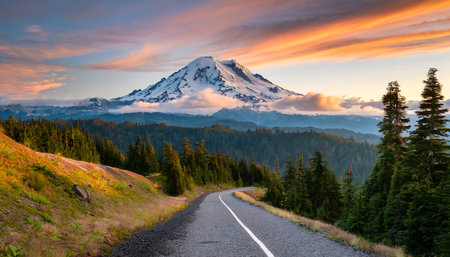road leading towards mount rainier or tahoma in cascades range with sunset clouds hovering low in sky