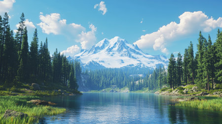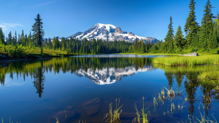 Breathtaking mountain landscape with snow capped peak and pristine alpine lake in lush wilderness