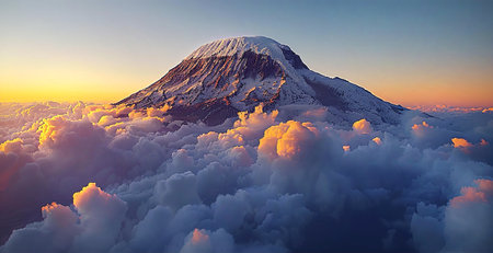 An enchanting view of a majestic snow-capped mountain peak rising above soft clouds at sunrise. The vibrant colors of the sky create a serene atmosphere.