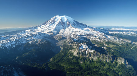 The majestic Mount Rainier rises dramatically above the surrounding landscape, showing its snowy summit and densely wooded valleys beneath a radiant blue sky.