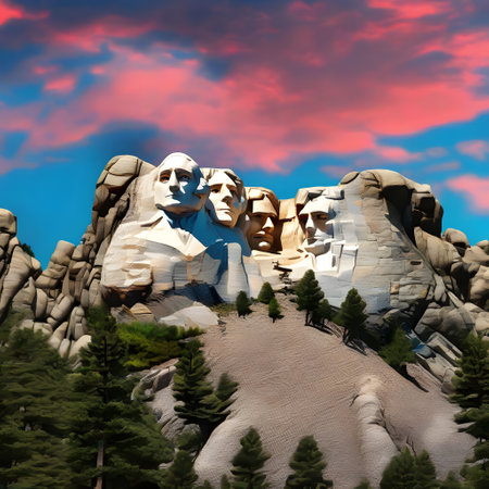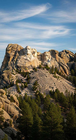 Mount Rushmore faces, granite mountain, blue sky, pine trees.