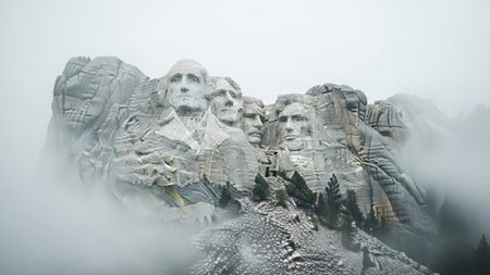 Mount Rushmore monument in fog, presidential faces on mountain, pine trees.