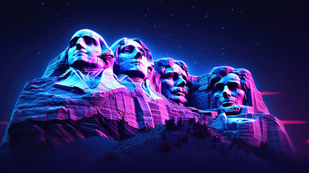 A night view of Mount Rushmore with the faces of four presidents glowing in blue and purple neon light. The sky is dark and starry. The presidents are looking out over a dark landscape.